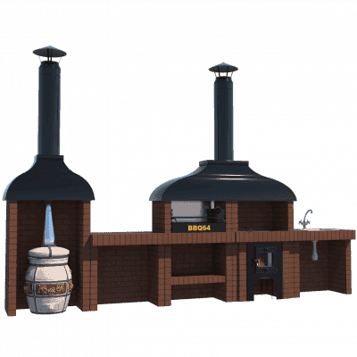 Pánev je nejoblíbenějším prvkem komplexu zděné grilovací pece, protože je určena pro grilování a mnoho dalších lahodných pokrmů. Základna a stěny pece jsou z červených keramických cihel. Kovová udírna se skládá ze dvou kopulí: pracovní o tloušťce 1,5-2 mm a dekorativní se smaltovaným povrchem. Komín je vyroben z dvouplášťového sendviče s izolací a je vyplněn lapačem jisker. Navíc je možné nainstalovat bránu pro regulaci spalovacího procesu. V topeništi, které je vyzděno šamotovými cihlami a má několik úrovní rámu pro špejle, je zabudována mangalová vložka s 3mm kovem. Zadní stěna je chráněna předním nerezovým reflektorem, aby nedocházelo k přehřívání zadní stěny topeniště. Tak lze gril vytápět nejen uhlím, ale také palivovým dřevem.